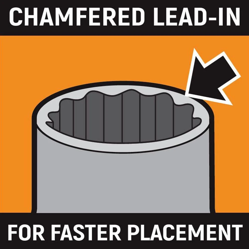- 1/2 in. drive: 8 12-point deep SAE sockets (1/2, 9/16, 5/8, 11/16, 3/4, 13/16, 7/8 and 15/16 in.)