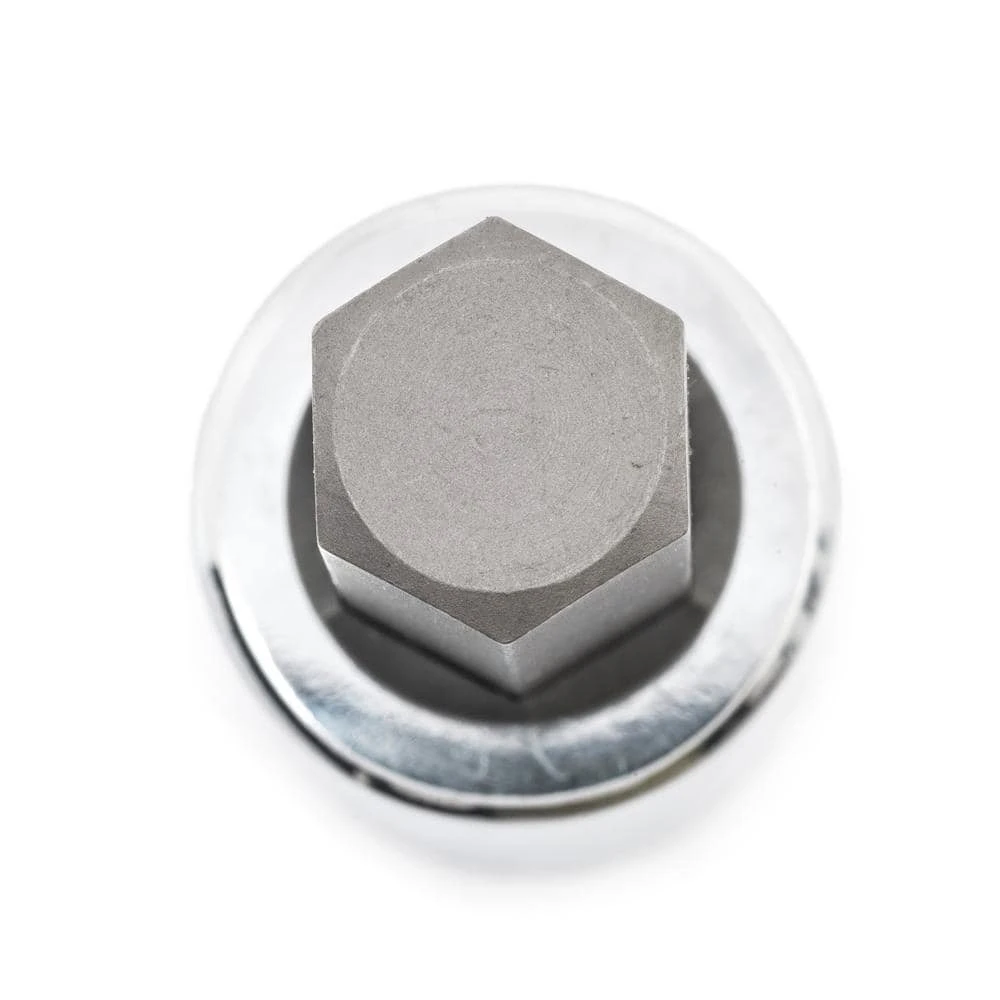 Heat Treated Socket Bases for Durability and Serviceability. Professional, Full Polish Chrome. Hex head internal dimple retention feature force bit surface to opposite side for maximum retention. Sizes hard stamped on body of socket for easy identification of size.