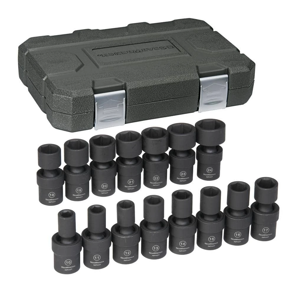 The GEARWRENCH 15-Piece 1/2 in. Drive Metric Impact Universal Socket Set is made from Chrome Molybdenum Ally Steel for exceptional strength and durability. The sockets utilize Surface Drive technology which provides off-corner loading for better grip and reduced fastener rounding. The Sockets are coated with manganese phosphate to resist corrosion.