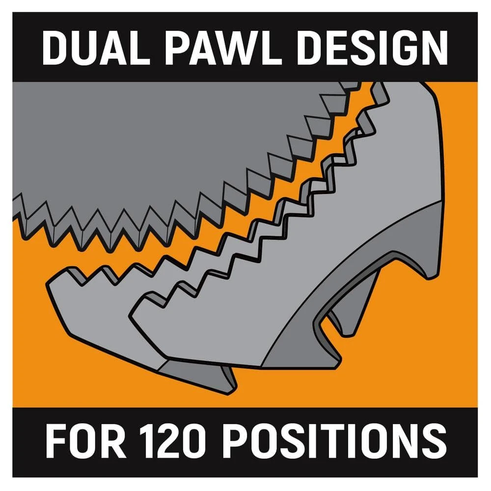 - Gear is alternately engaged by the double-stacked pawls which give a 3 swing arc for faster work