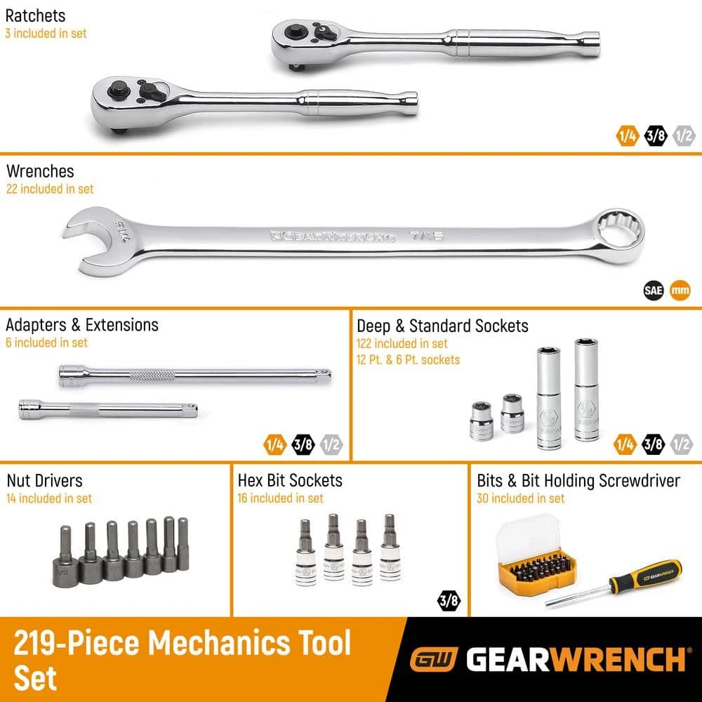 The GEARWRENCH 219-piece mechanic tool sets is a comprehensive set that comes packed in a 3-drawer storage box. The storage box includes independent sliding drawers, side flaps to lock drawers in place, a steel hinge and durable handle. This set comes with a wide assortment of tools to complete your task at hand.