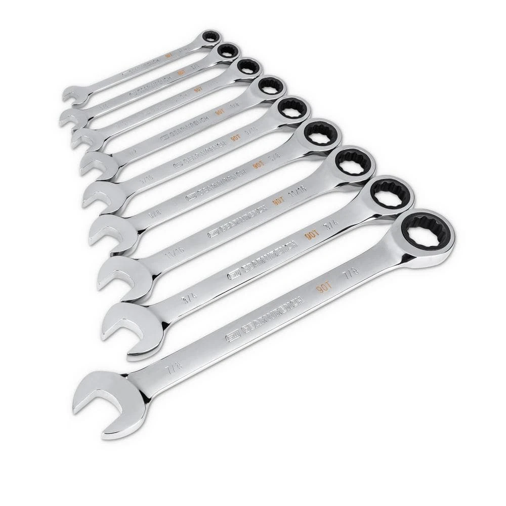 - Includes 90-tooth full polish chrome handle, teardrop shaped head ratchets, with flush mounted on-off lever