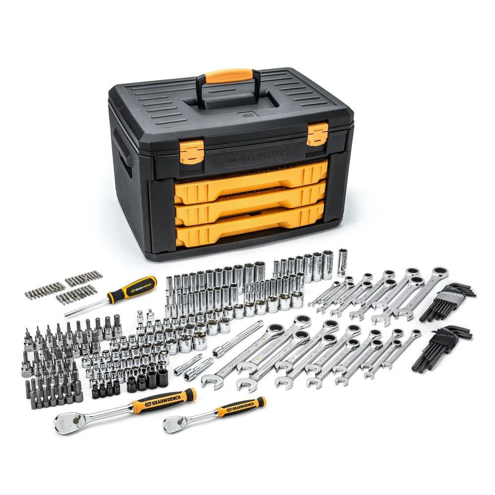 The GEARWRENCH 232-piece Mechanics Tool Set comes in a 3-drawer storage box for a convenient tool kit. The set includes all common items from ratcheting wrenches, deep and shallow 6-point and 12-point sockets, screwdriver and bits to E-torx, torx bits and Allen keys. A great set for either the DIY-er who wants quality tools in an organized portable box, or for the Professional who wants a tool set to bring to different jobs. Each drawer opens independently of each other and includes side flaps to lock closed preventing a big mess. See specification sheet for a list of all tools included along with their sizes!