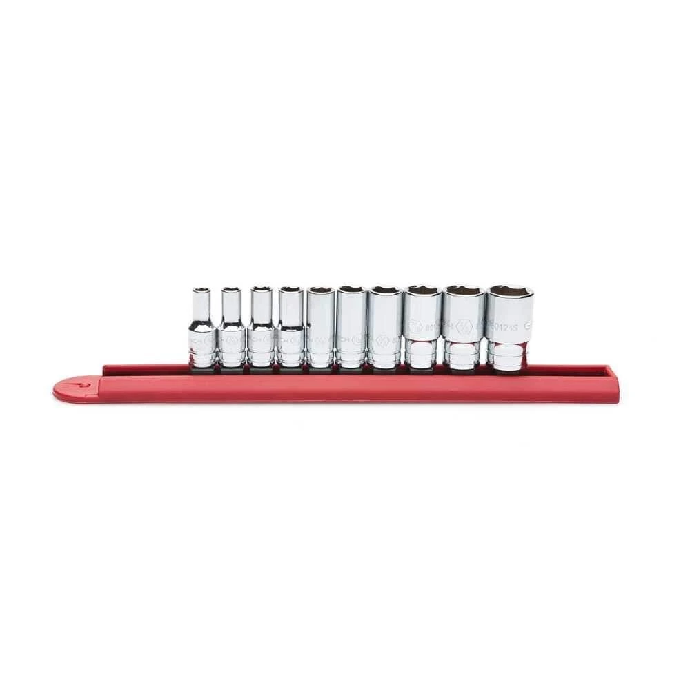 The GEARWRENCH 10-Piece 1/4 in. Drive Mid Length Socket Set, SAE includes a socket rail for easy storage. The sockets utilize Surface Drive technology which provides off-corner loading for better grip and reduced fastener rounding. All pieces feature a full polish chrome finish for durability and corrosion resistance.
