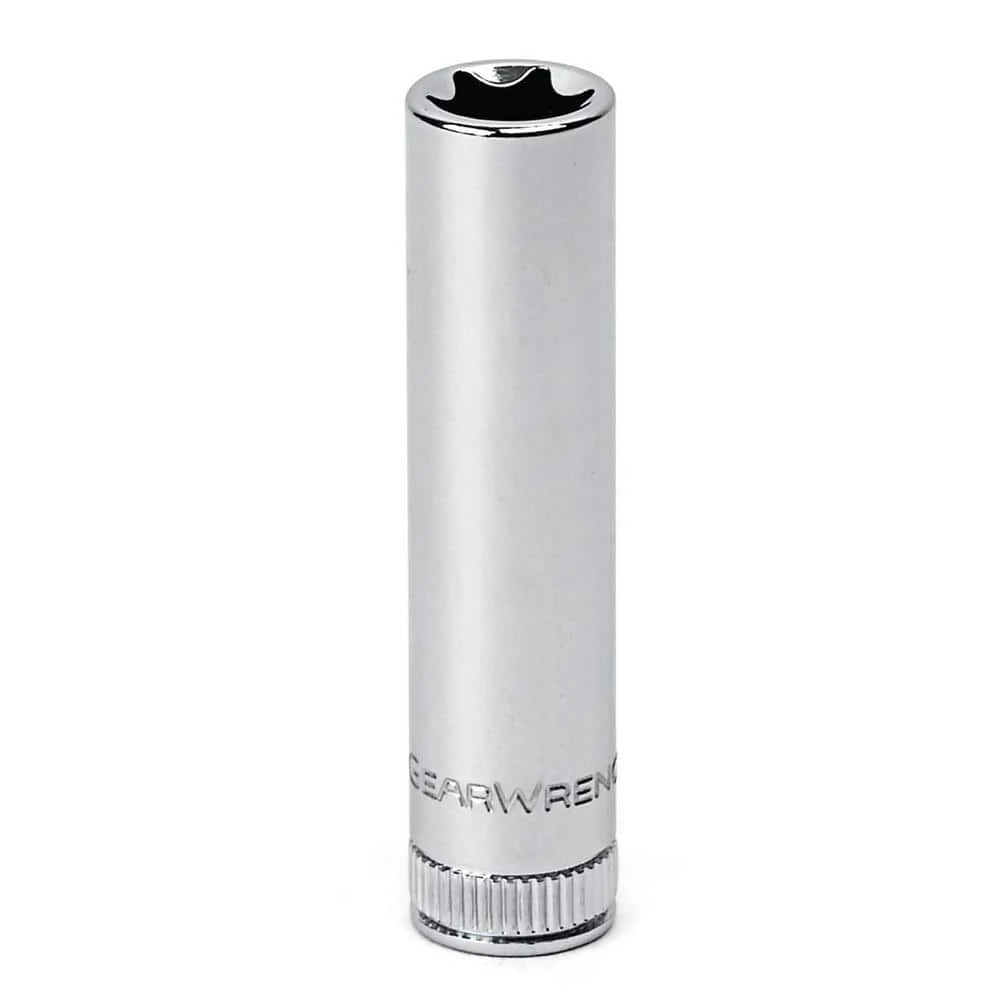 GEARWRENCH bit sockets are made of chrome with heat treated bases for durability and serviceability. Packed on clip rail sets. GEARWRENCH sockets have serration depths as deep as the fastener and large hard-stamped identification. Entry angle guides fastener. Double line (SAE) and Knurled line (MM) to easily identify standard versus metric sockets.