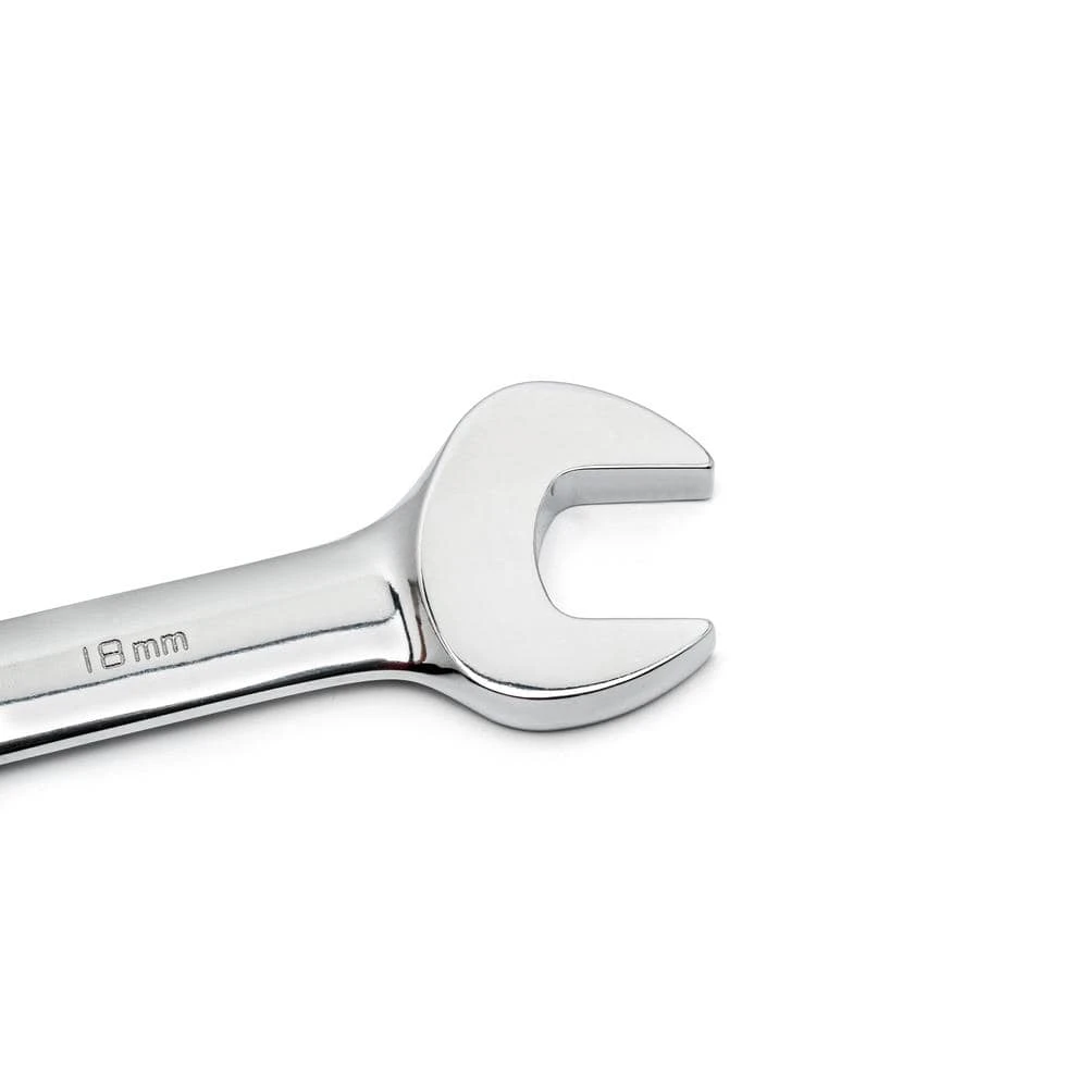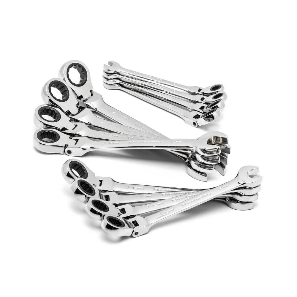 GEARWRENCH Flex Head Ratcheting Combination Wrench Set is made of carbon steel for strength. The ratcheting box end needs as little as 5° to move fastener vs. 30° for standard box end wrenches. Surface Drive design nearly eliminates fastener rounding.