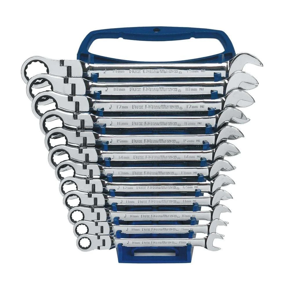 GEARWRENCH Flex Head Ratcheting Combination Wrench Set is made of carbon steel for strength. The ratcheting box end needs as little as 5° to move fastener vs. 30° for standard box end wrenches. Surface Drive design nearly eliminates fastener rounding.