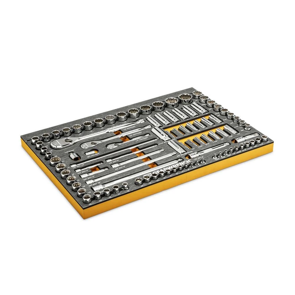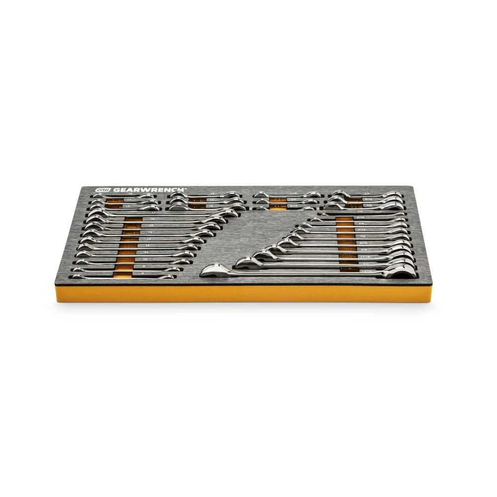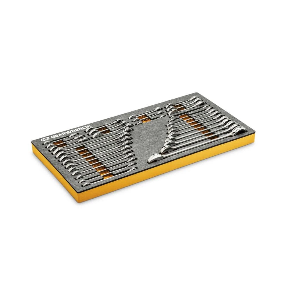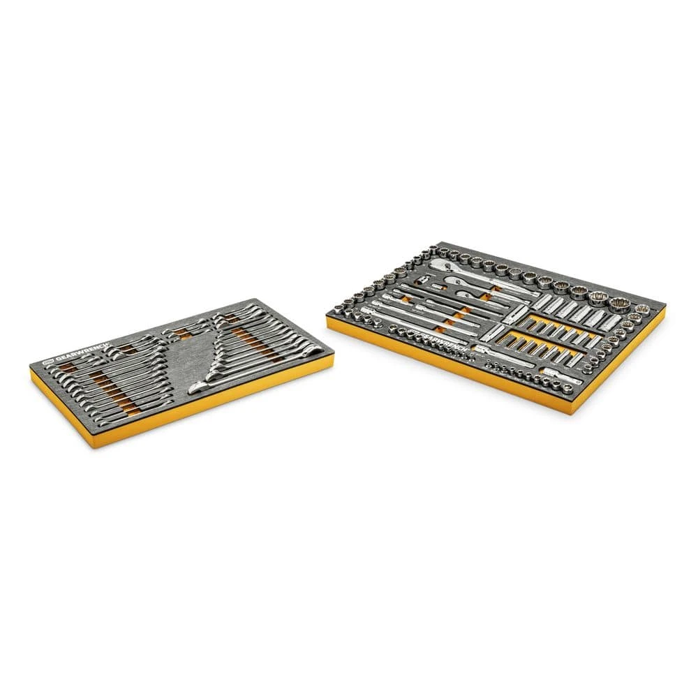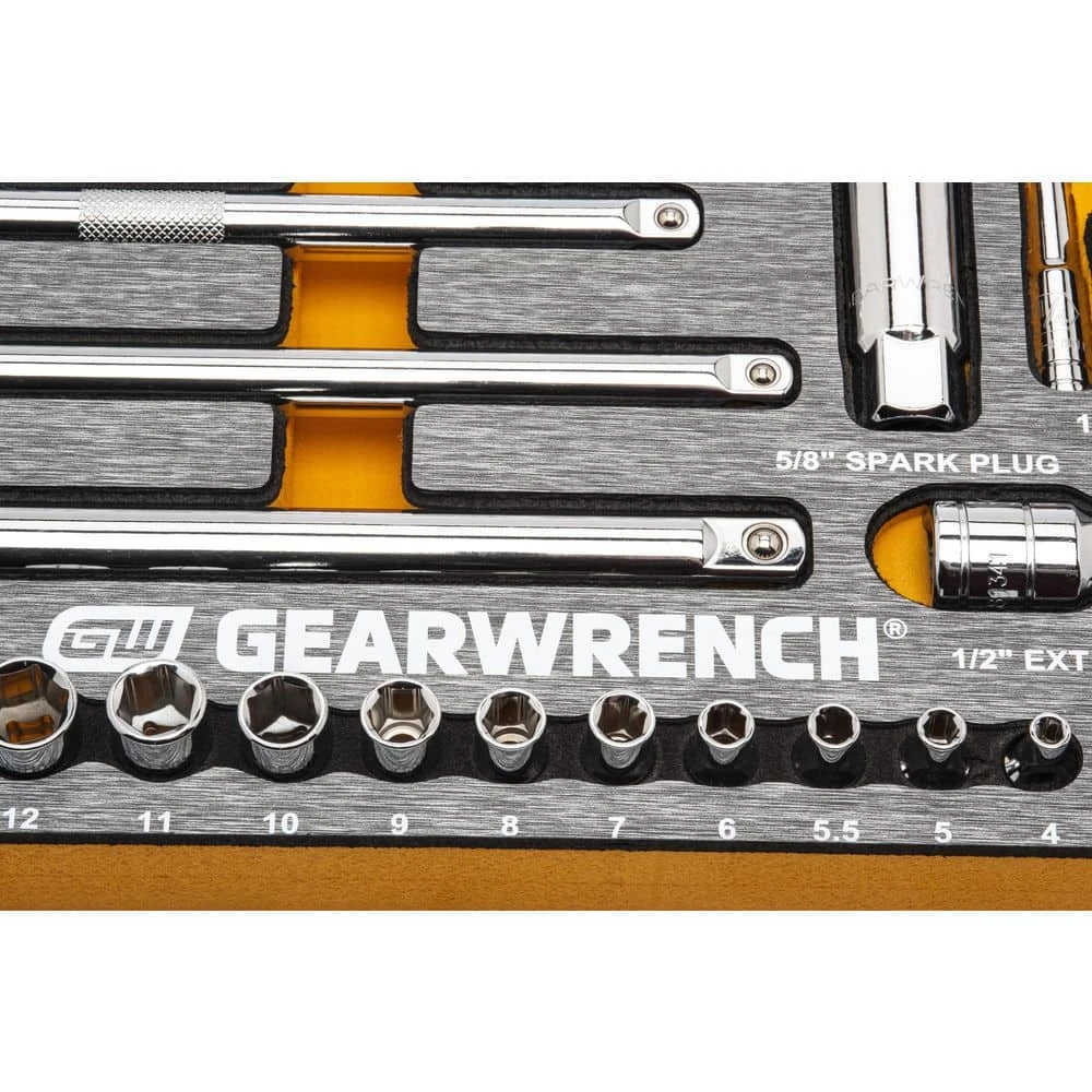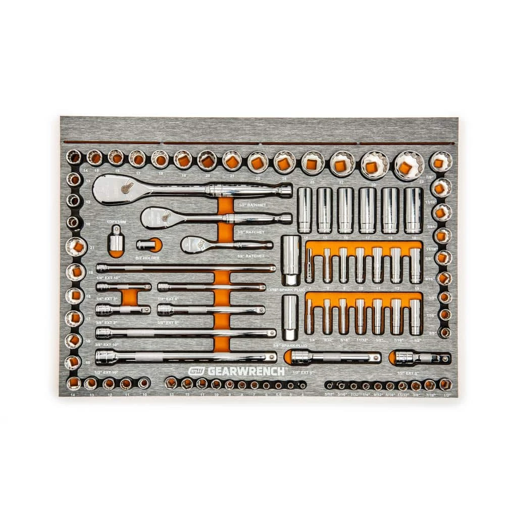 GEARWRENCH is a premier mechanics hand tool brand, offering products that are designed to meet the tough requirements of Professional Mechanics and Automotive Enthusiast. This 94-piece Socket Mechanic Tool Set is a staple for every tool box and features popular socket sizes for a variety of jobs. The Metric and SAE Mechanics Hand Tool Set in EVA foam includes a 1/4 in. ratchet, 3/8 in. ratchet and 1/2 in. ratchet that all feature a low profile head and flush mounted reversing lever for greater access. The sockets feature large hard-stamped part numbers and size on both sides of the socket allowing for easier viewing of the socket sizes and double lines (SAE) and knurled lines (metric) for easy SAE versus Metric identification. The wrenches have a 72-tooth ratcheting box end that needs a minimal 5° to move fasteners verse 30° for standard wrenches.