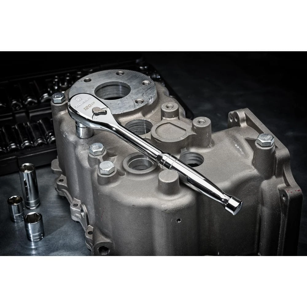 - 1/4 in., 3/8 in., 1/2 in. drive 120XP tooth full polish chrome ratchets, with 3° ratcheting arc ratchet with teardrop low profile head and flush mounted on/of switch for improved access