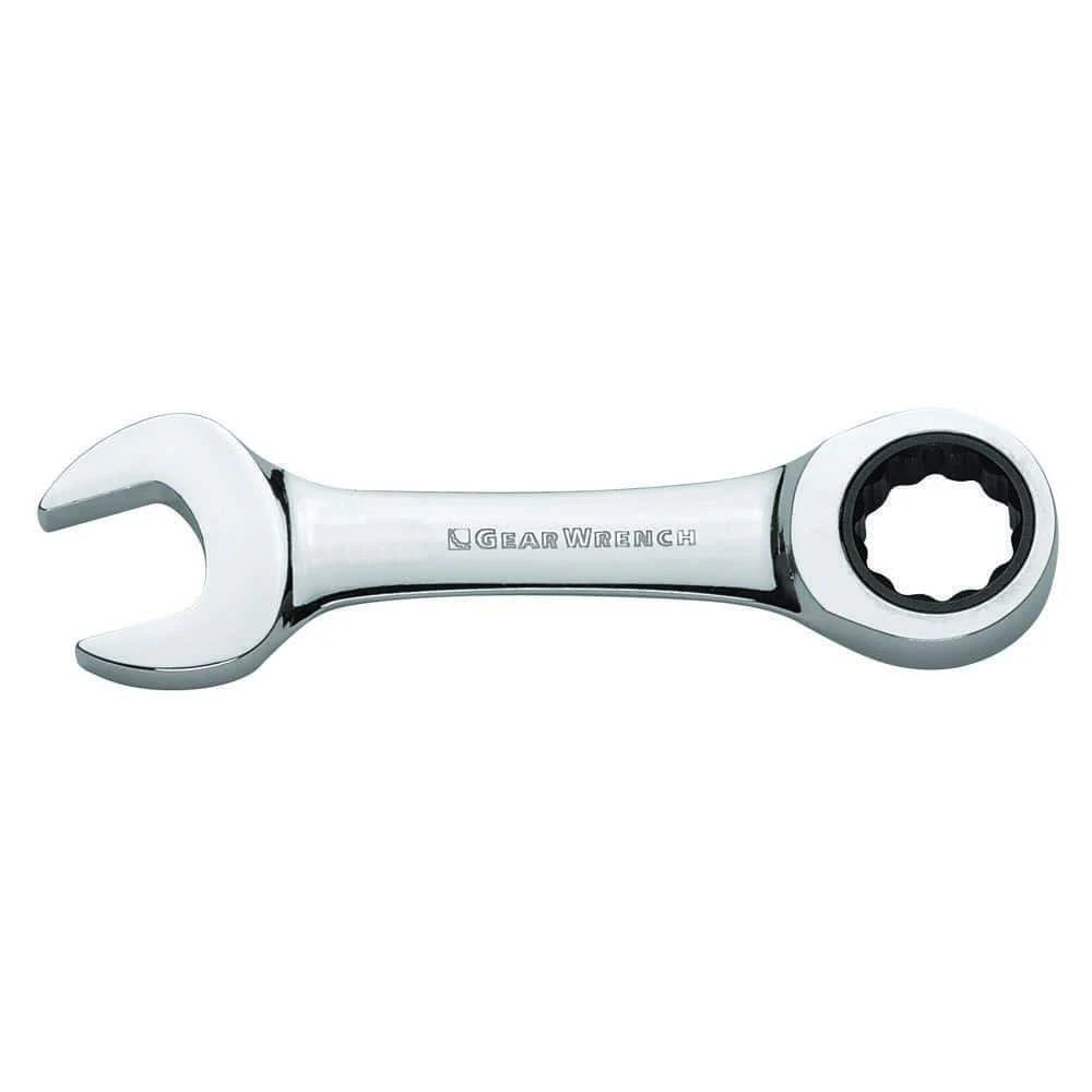 The GEARWRENCH 15 mm Stubby Combination Ratcheting Wrench features a full chrome polish finish for durability and corrosion resistance. Ratcheting box end increases productivity while reducing hand fatigue. The box end utilizes Surface Drive technology which provides off-corner loading for better grip and reduced fastener rounding.