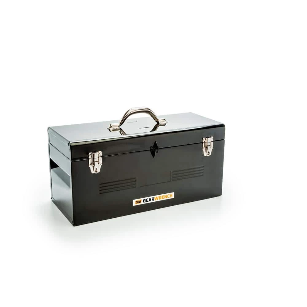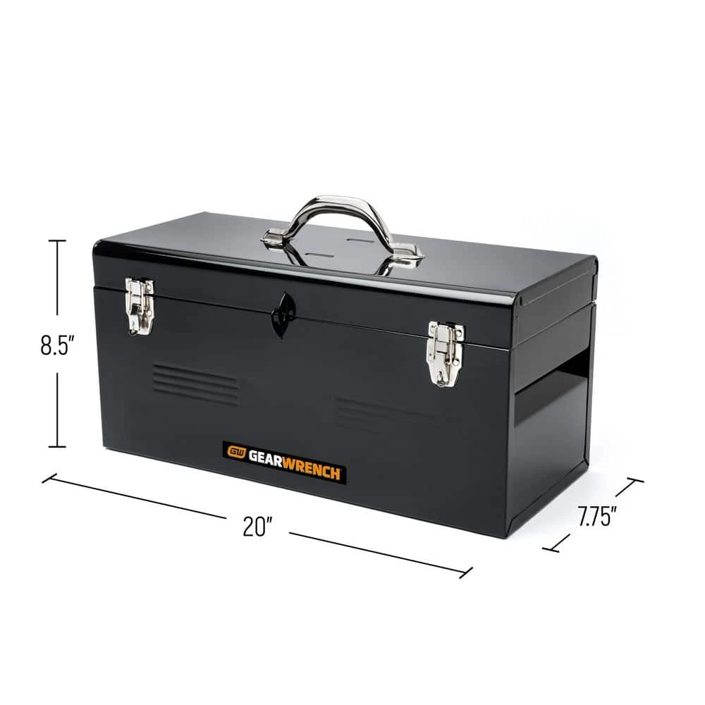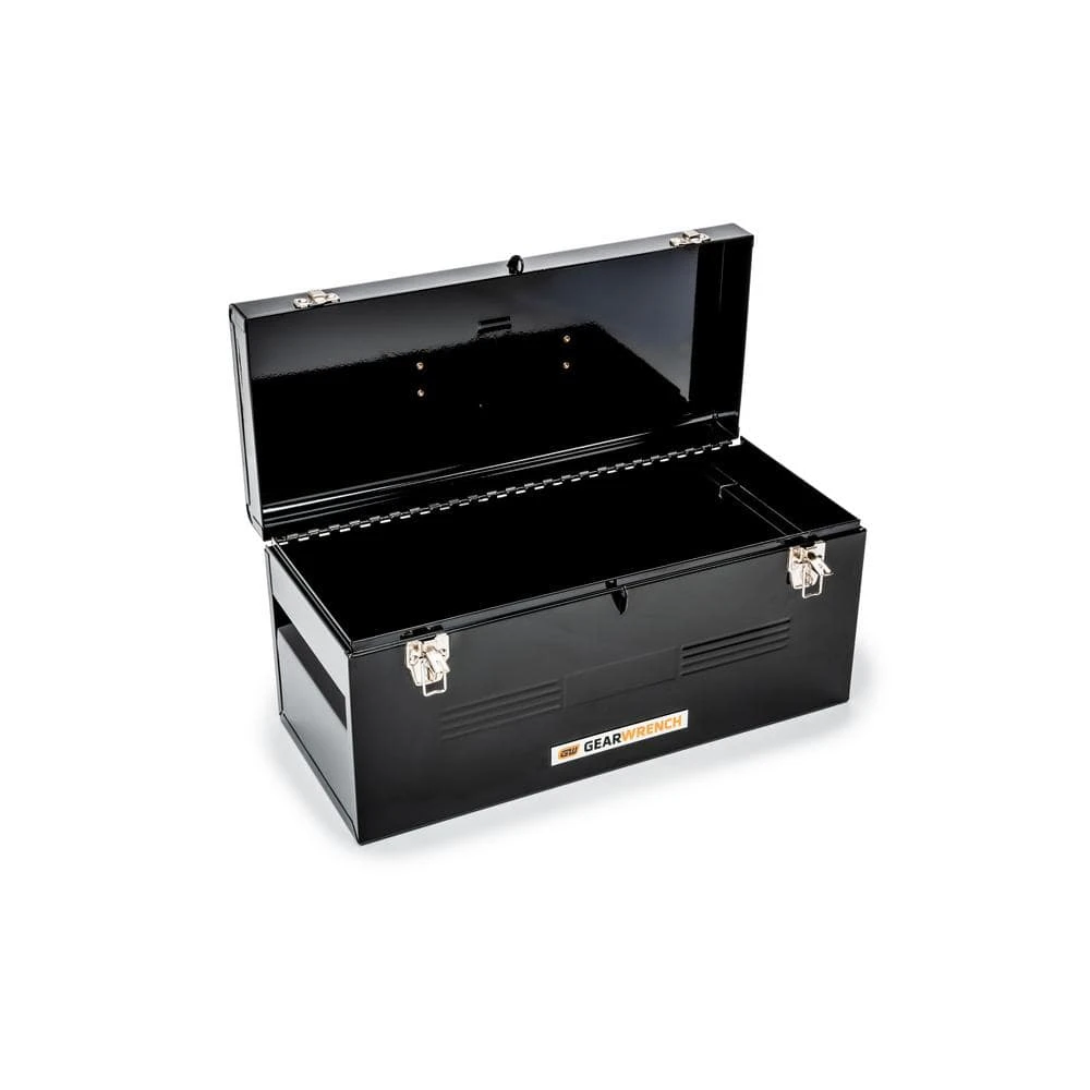 The 83130 is a black 19 in. steel tote box that includes a steel tote tray stored inside. The box measures 19 in. x 6 in. x 6.5 in. and is constructed completely from steel for incredible durability. The box has dual latches with locking clasps.