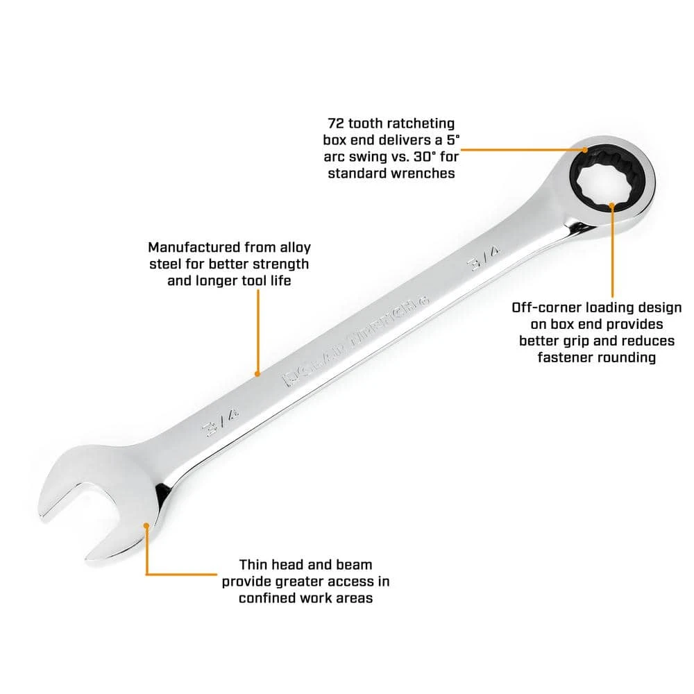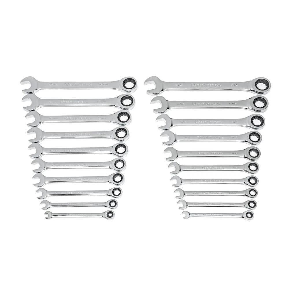 GEARWRENCH is a premier mechanics hand tool brand, offering products that are designed to meet the tough requirements of Professional Mechanics and Automotive Enthusiast. This 20-piece SAE/Metric Combination Ratcheting Wrench Set is a staple for every tool box and features popular wrench sizes for a variety of jobs. With a full polish chrome finish for durability, the ratcheting wrench allows the user to work seamlessly to help increase productivity.