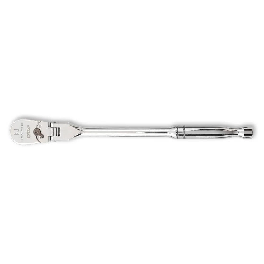 The GEARWRENCH 120 XP 3/8 inch Drive Flex Head Ratchet take access to the next level, making it easier and quicker to complete jobs where hard to reach fasteners used to be an obstacle. The low-profile teardrop ratchet head and flush mounted on/off switch allow better access in tight spaces. The Double Stacked 60 tooth Pawl design delivers 120 Positions for a 3° swing arc by engaging each pawl separately. This design allows for greater access while still exceeding ASME torque performance requirements. This allows the ratcheting flex head easy access to fasteners in tight access areas, delivering extreme productivity. GEARWRENCH flex ratchets feature an O-ring sealed head design to protect against dirt infiltration to help you GET IT DONE.