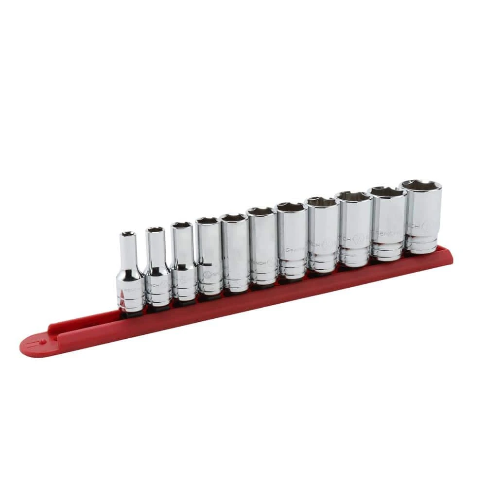 The GEARWRENCH 11-Piece 3/8 in. Drive Mid Length Socket Set, SAE includes a socket rail for easy storage. The sockets utilize Surface Drive technology which provides off-corner loading for better grip and reduced fastener rounding. All pieces feature a full polish chrome finish for durability and corrosion resistance.