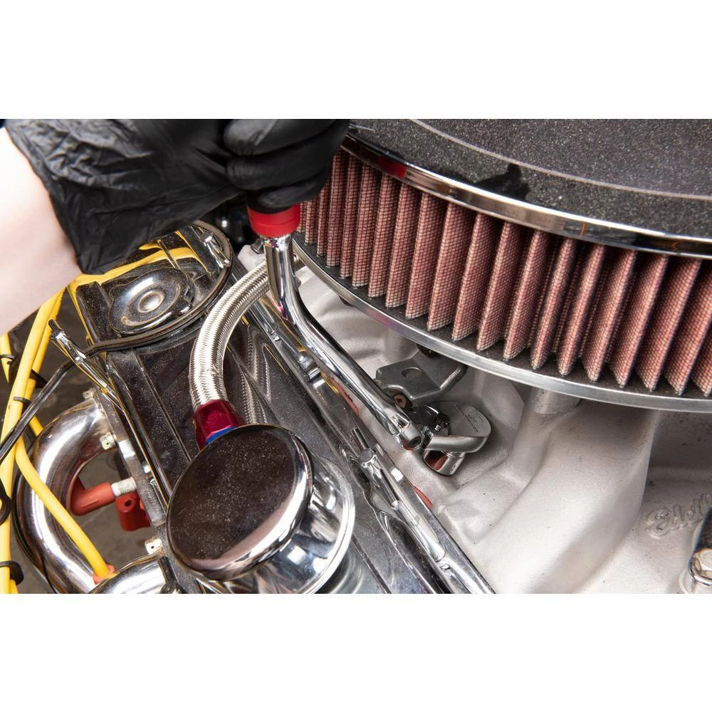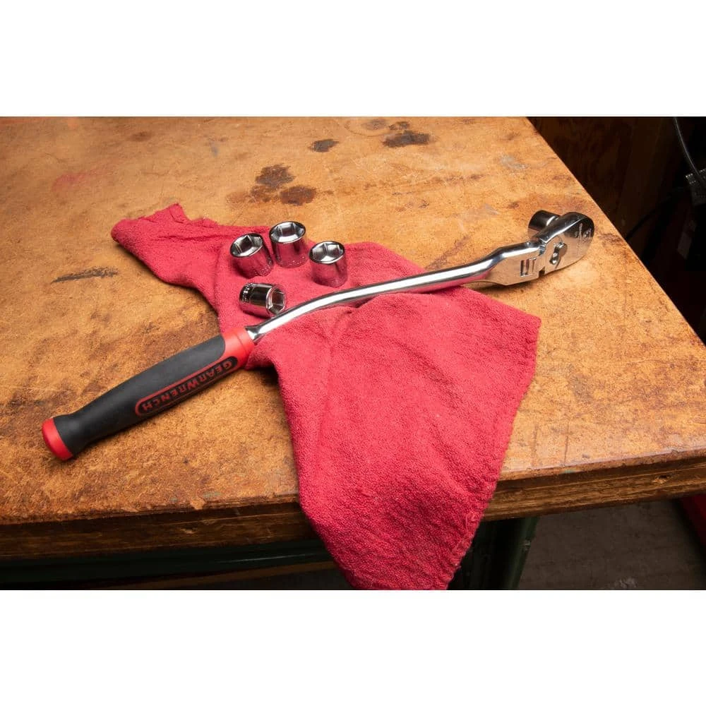 The GEARWRENCH 3/8 in. Drive Cushion Grip Offset Flex Handle Ratchet features full chrome polish finish ratchets for durability and corrosion resistance. The teardrop low profile head and flush mounted on/off switch allow better access in tight spaces. The enclosed head is designed for extreme resistance to dirt.