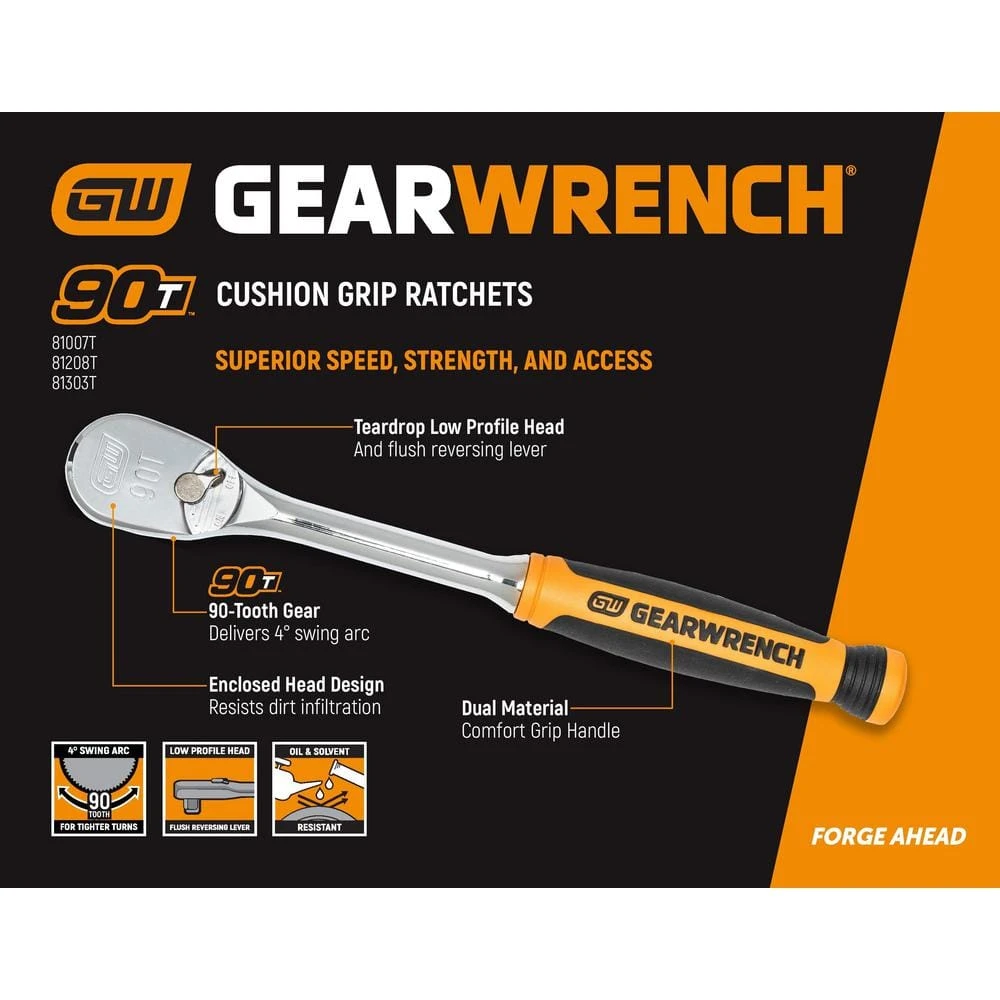 This GEARWRENCH 90-tooth 3/8in. drive ratchet has a 4° swing arc and features a low-profile head for easier access to hard-to-turn fasteners. Our 90-tooth design exceeds ASME torque performance requirements, delivering one of the strongest ratchets on the market. The 3/8 drive ratchet head features a flush mounted reversing lever which helps eliminate accidental reversing when in use and the ratchet head is conveniently marked with the on and off positions of the reversing lever to quickly identify which direction the ratchet will function in. This 3/8 ratchet features an ergonomic dual material comfort grip to help reduce hand fatigue during higher torque applications. GEARWRENCH ratchets feature a sealed head design to protect against dirt infiltration to help you GET IT DONE.