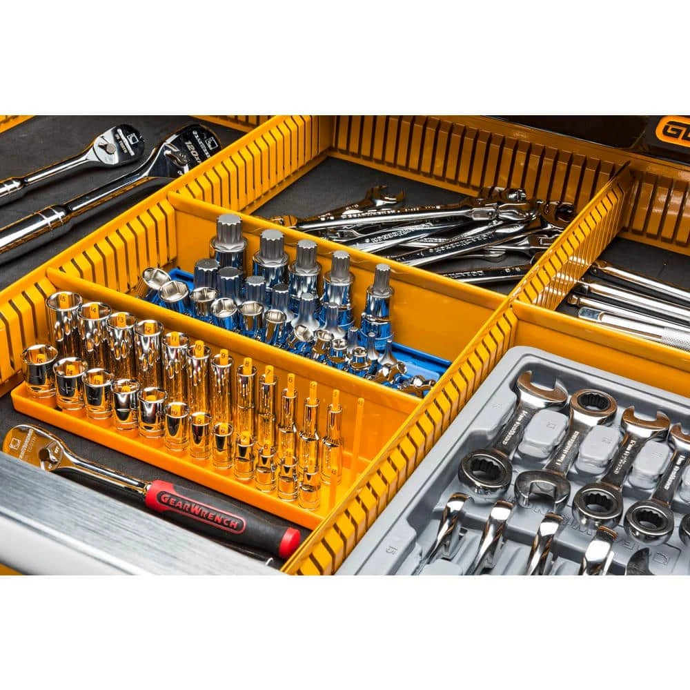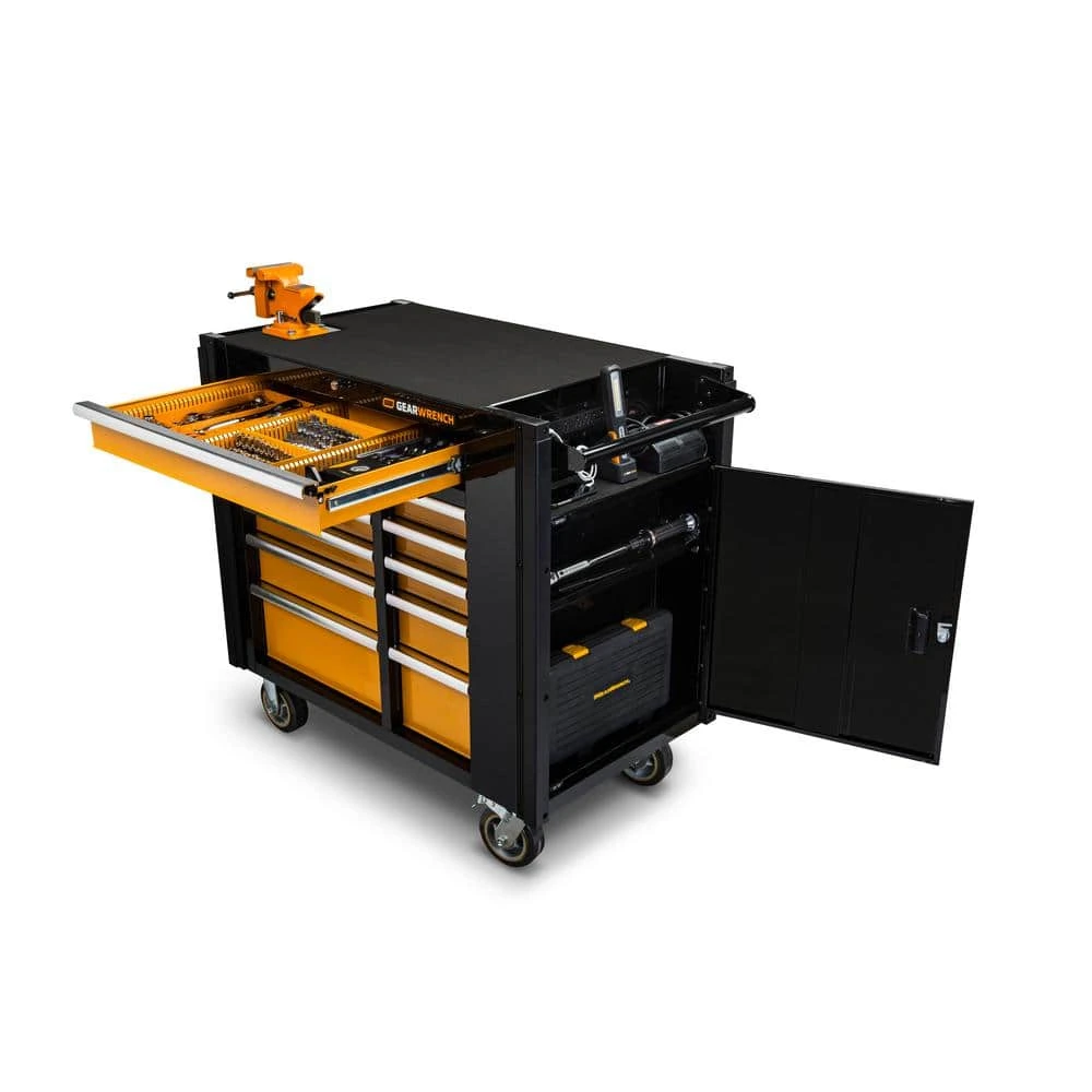 The GEARWRENCH Mobile Work Station is more than just a tool chest on wheels. Its purpose built from the ground up to help industrial mechanics and automotive techs keep their important tools and supplies organized. So when things need to get fixed fast, the guys who know how to do it arrive fully prepared. We start with the strongest frame in the business, because we know this beast is going to need to hold a lot. Like 19,000 cu. in. of combined drawer, locker and tray volume nearly 20% more than the closest competitor. The Mobile Work Station has a total load capacity of 1-Ton and each of its 11 ball bearing slide drawers is rated at 100 lbs. It rolls easy on bigger, tougher wheels than any of the other guys each of its 6 in. x 2 in. industrial grade polyurethane locking casters has a capacity of 800 lbs. With Mobile Work Station extras like vise-mount capability, locking storage, a built-in 6-outlet, 2 USB port power strip and more, we’ve once again raised the bar on productivity innovation GEARWRENCH. Forge Ahead.