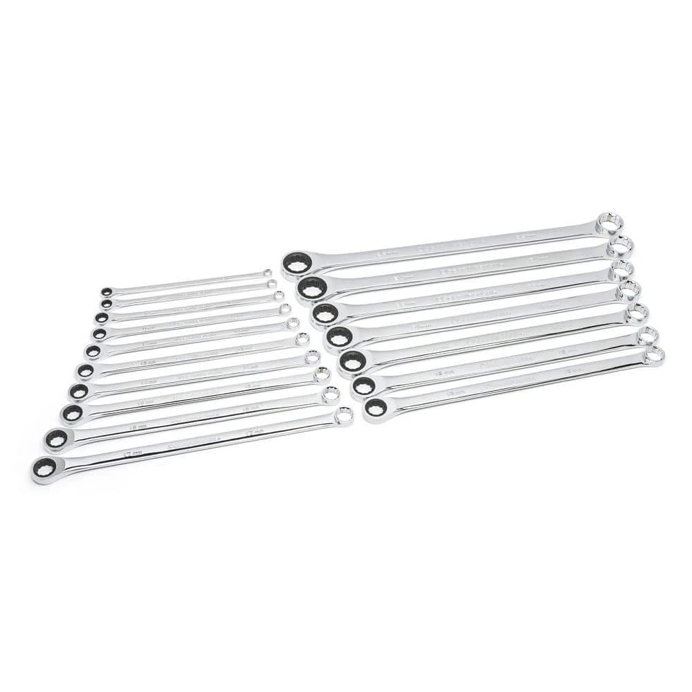 GEARWRENCH is a premier mechanics hand tool brand, offering products that are designed to meet the tough requirements of Professional Mechanics and Automotive Enthusiast. This 17-Piece GearBox Metric Ratcheting Wrench set is a staple for every tool box and features popular wrench sizes to complete your set of tools for a variety of jobs. The metric ratcheting wrenches needs as little as 5-Degree to move the fastener as opposed to 30-Degree for standard box end wrenches. The standard box end combined with the long pattern length gives this wrench excellent torque capabilities to break a stubborn, rusted fastener. The standard end also features a deep box design which is perfect for reaching recessed fasteners. These double box end ratcheting wrenches are made from premium alloy steel for a precision, long lasting tool.