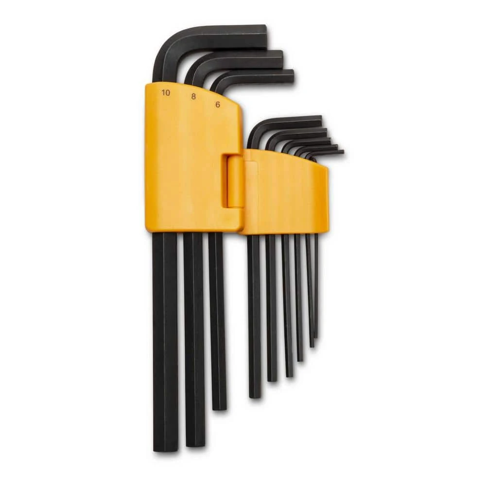 The GEARWRENCH 9-piece metric long arm hex key set includes hex keys made from alloy steel to deliver maximum strength and resist rotational distortion. Chamfered edges help slide the hex keys easily into fasteners and a clearly labeled caddy offers convenient storage. Includes caddy for storage and organization.
