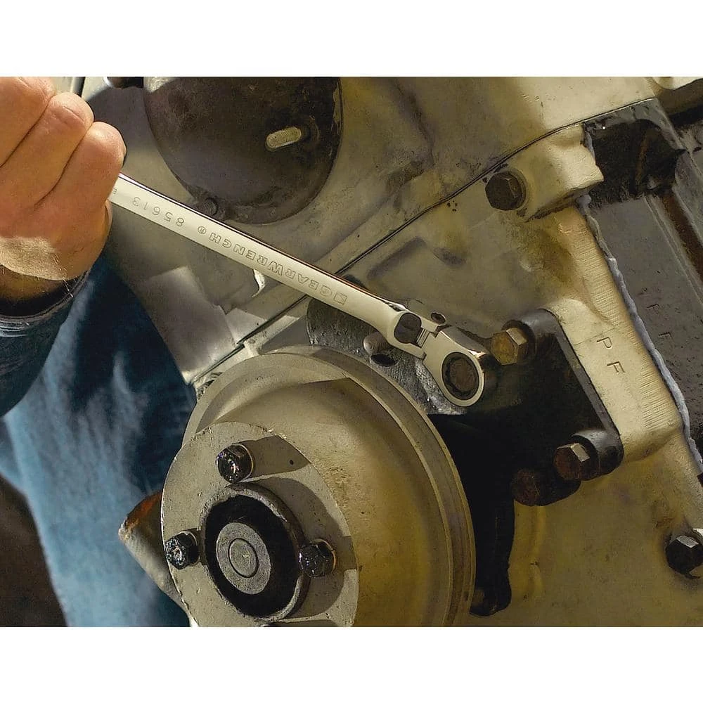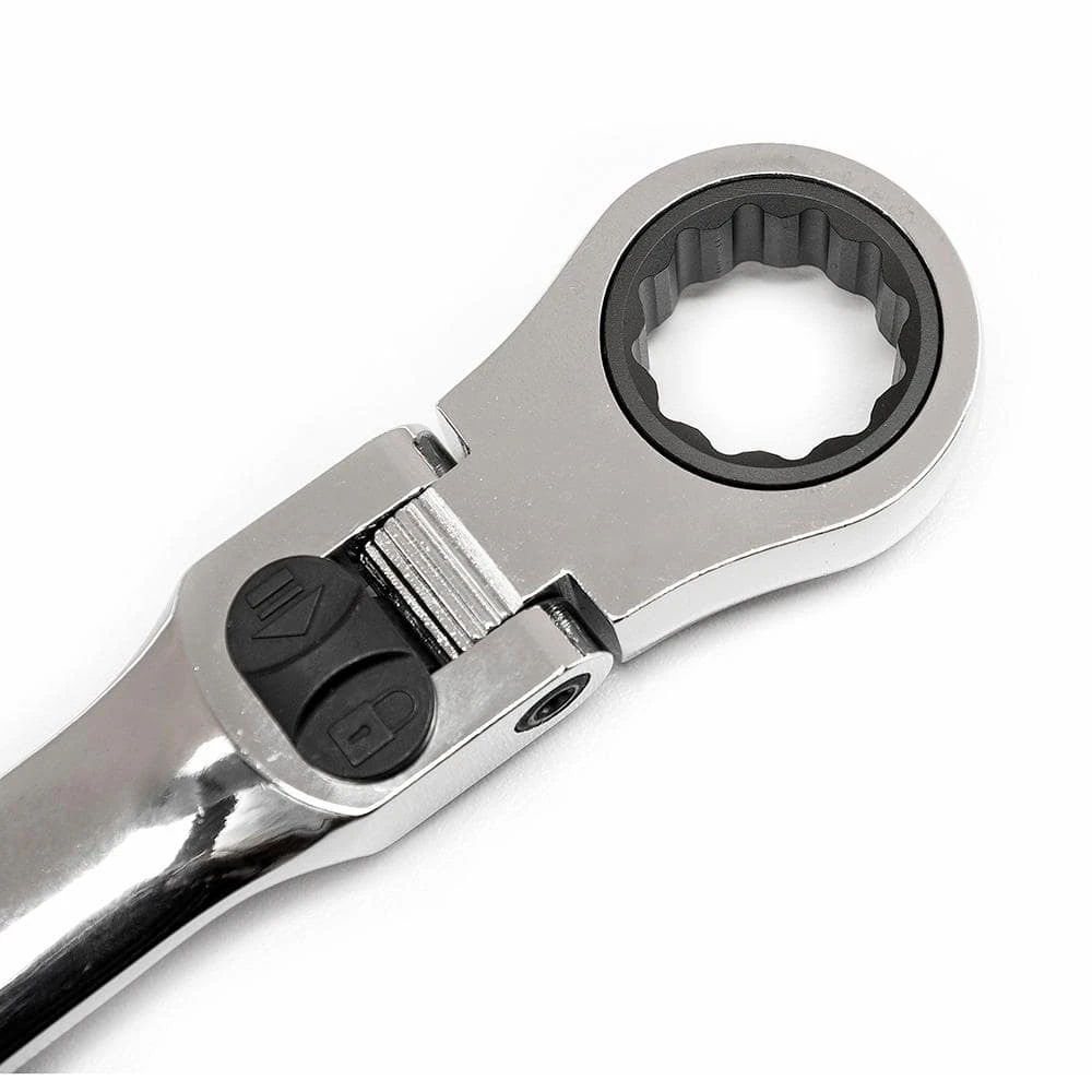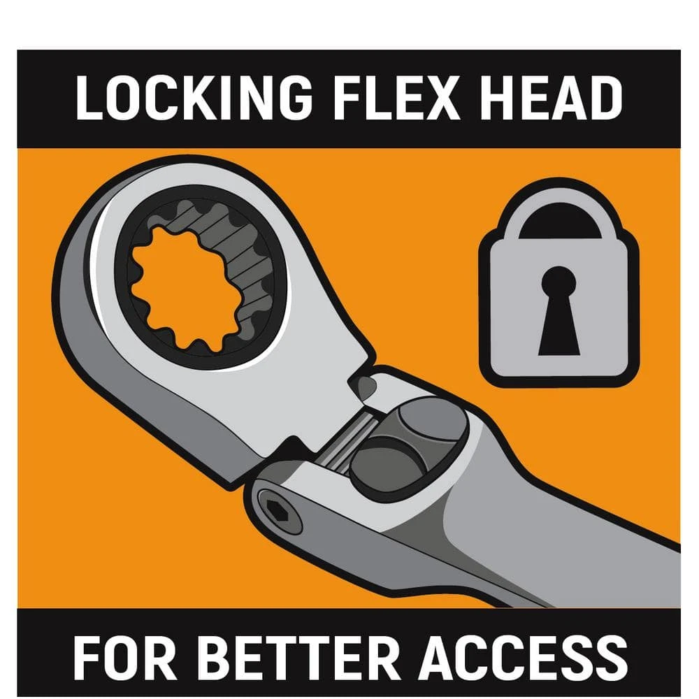 Surface Drive on Box End provides off-corner loading for better grip and reduced fastener rounding. 72 Teeth Ratcheting box end needs as little as 5ยฐ to move fasteners versus 30ยฐ for standard box end wrenches. The flex head offers 13 locking positions for greater access.