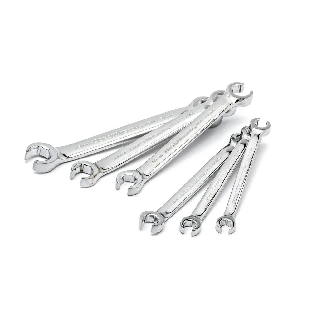 The GEARWRENCH 6-Piece Metric Flare Nut Wrench Set comes in a blow molded tray for easy tool storage. The wrenches feature a full polish chrome finish for durability and corrosion resistance. 15 offset wrench head gives better clearance and access around obstructions.