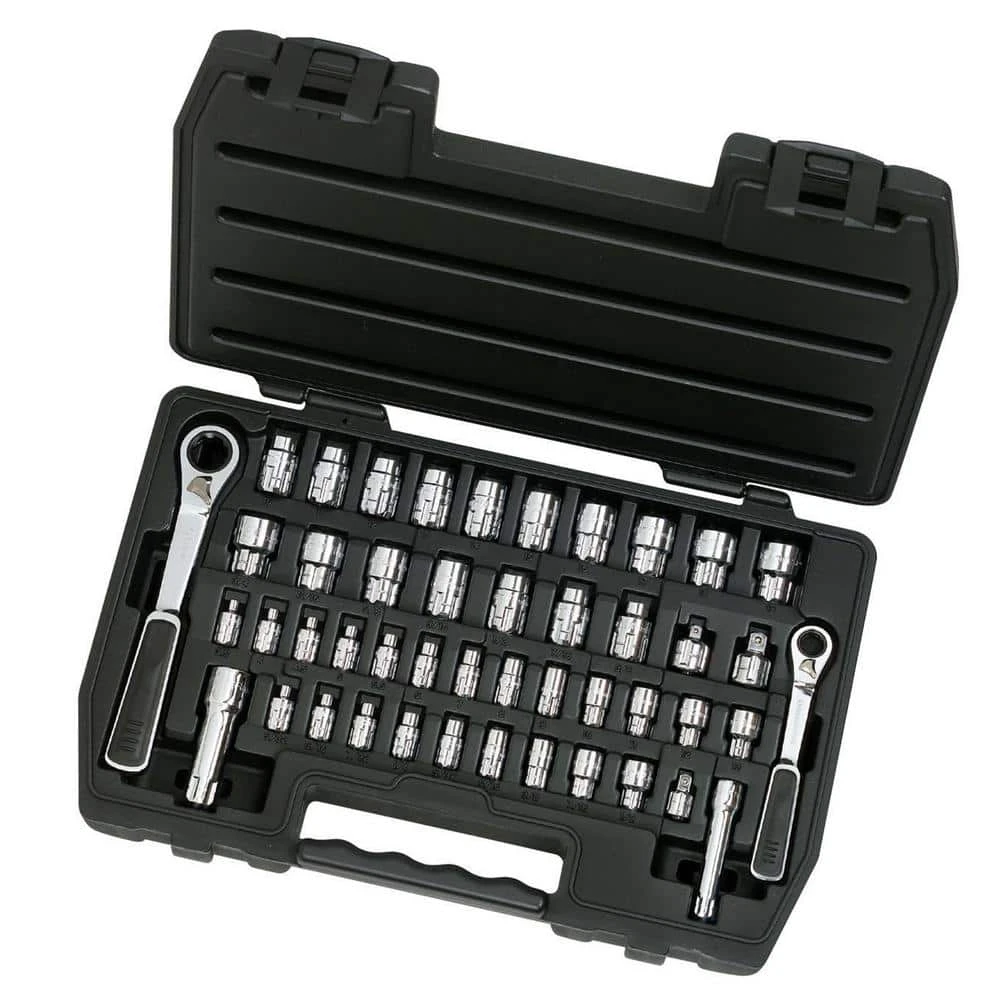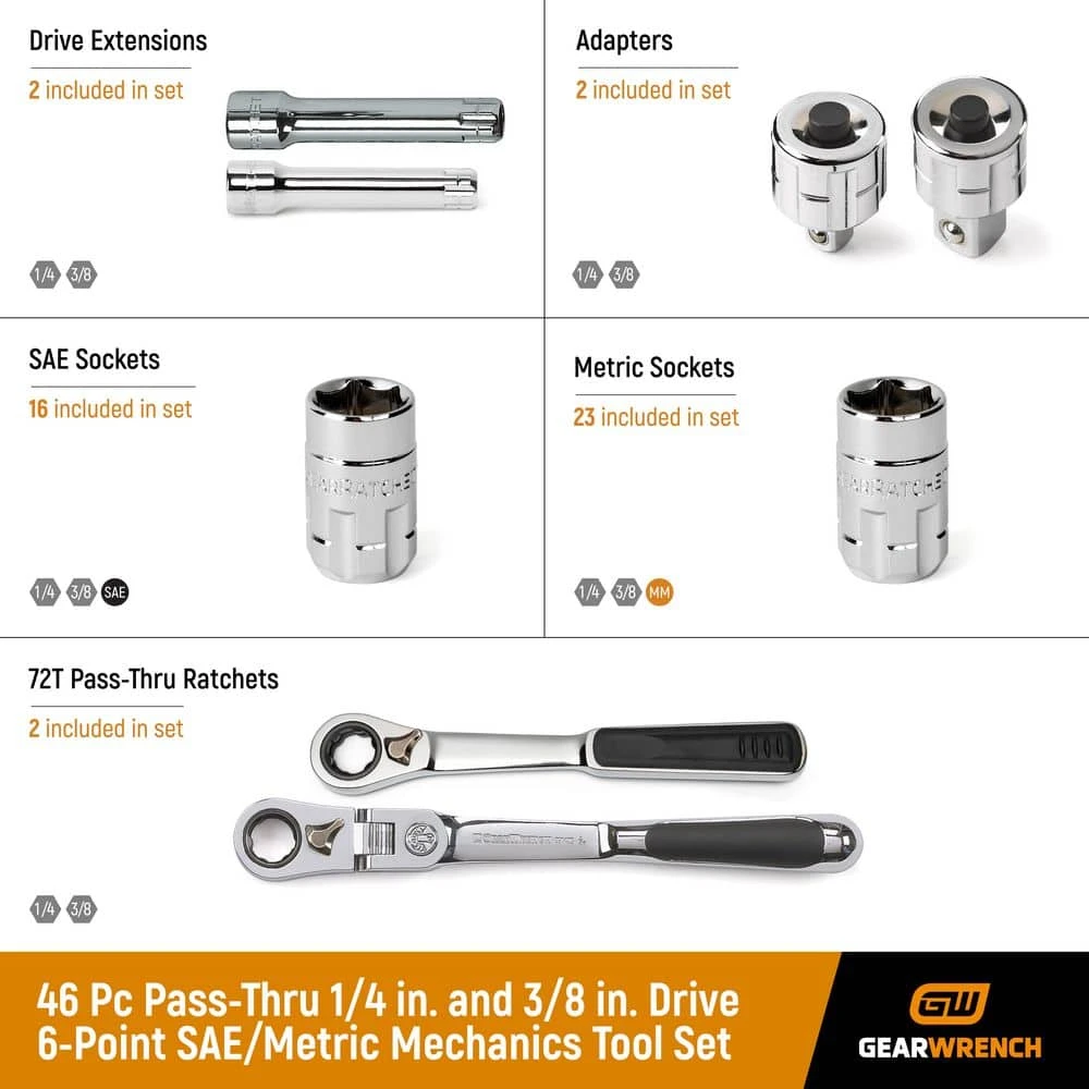 The Pass-Thru socket and GearRatchet ratchet system by GEARWRENCH was designed to improve productivity and access on every job. The GearRatchet ratchets need as little as 5° to move fasteners versus 30° for standard wrenches and are 40% stronger than standard ratchets by eliminating the drive tang. The ratchets are up to 50% thinner than standard ratchets providing superior access to even the most hard to reach fasteners. The Pass Thru sockets are a thin wall design. They replace the need for deep well sockets as they loosen and drive nuts on bolts of any length. The pass-thru sockets integrate into the GEARWRENCH GearRatchet handle, reducing overall height and increasing torque strength. The GEARWRENCH adapter allows for the use of standard sockets and drive tools. The 8946 is a 46-piece 1/4 in. and 3/8 in. drive SAE/metric 6 point set featuring SAE and metric sockets,3 drive adapters to convert for use with standard socket sets, 2 extensions and 2 GearRatchet ratchets . Set is in a blow molded case for storage and tool retention.