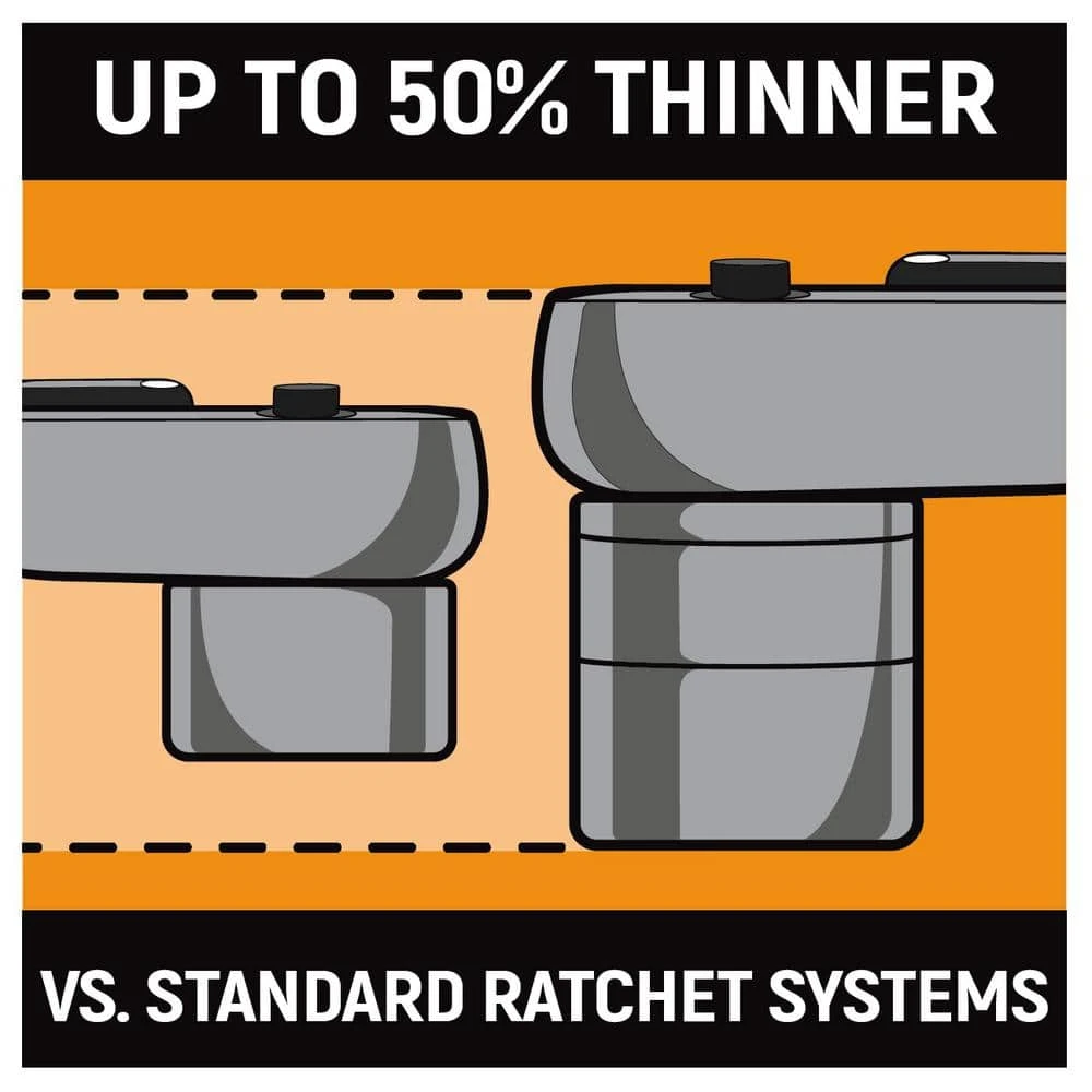 - Gear ratchet is up to 50% thinner than conventional ratchet systems
