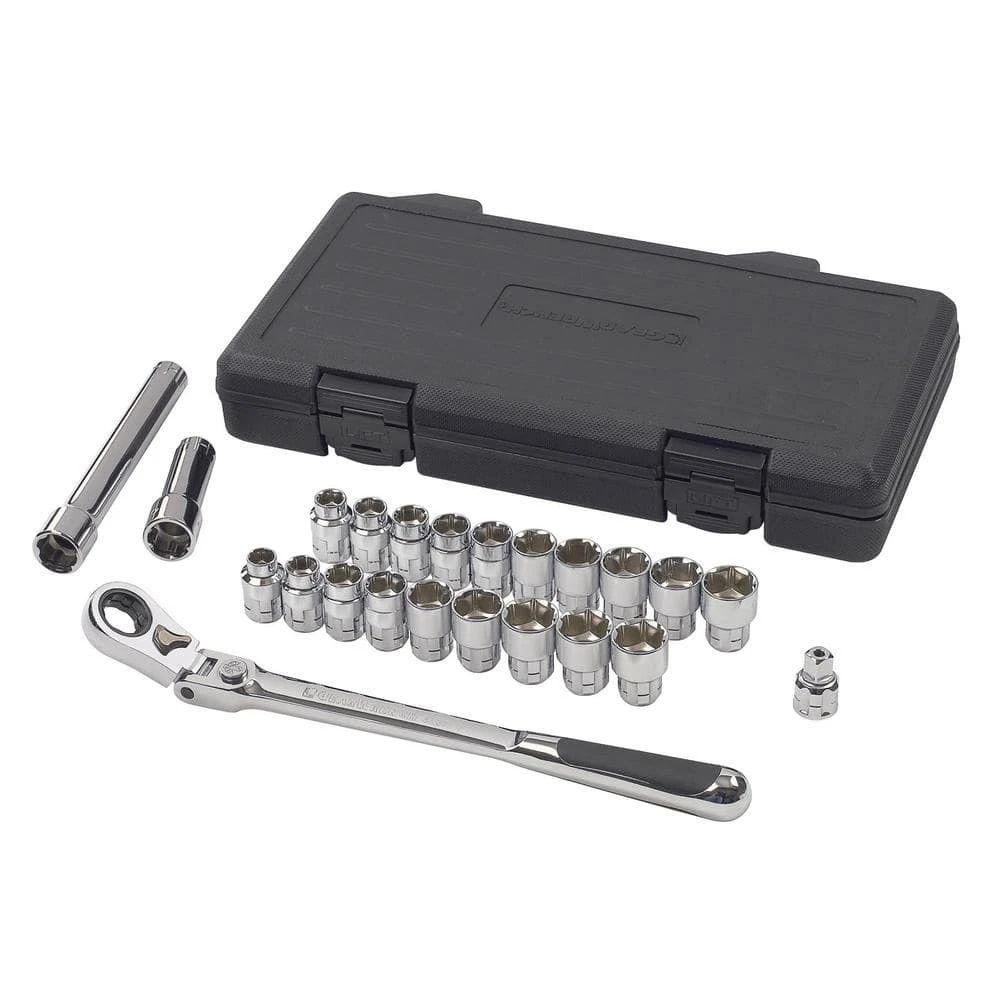 Pass-Through Ratchet, Socket and extension system loosens and drive nuts on bolts of any length. Replaces standard deep sockets which are limited to bolts the length of the deep socket. Set includes 17 sockets: 3/8 in., 7/16 in., 1/2 in., 9/16 in., 5/8 in., 11/16 in., 3/4 in., 13/16 in., 7/8 in., 10, 11, 12, 13 mm, 14 mm, 15 mm, 16 mm, 17 mm, 18 mm and 19 mm, 2 – Drive Adapters 1/4 in. and 3/8 in. to convert for use with standard 1/4 in. and 3/8 in. drive socket sets, 1-3 in. hole-through extension and 1 – gear ratchet. Vortex sockets integrate into the gear ratchet handle instead of attaching to a square drive, reducing overall height and increasing torque strength. The gear ratchet adapter allows for the use of standard sockets and drive tools and features a Quick Button Release. Vortex thin wall sockets have the same torque strength as an ordinary socket. Blow Molded Case for secure storage.