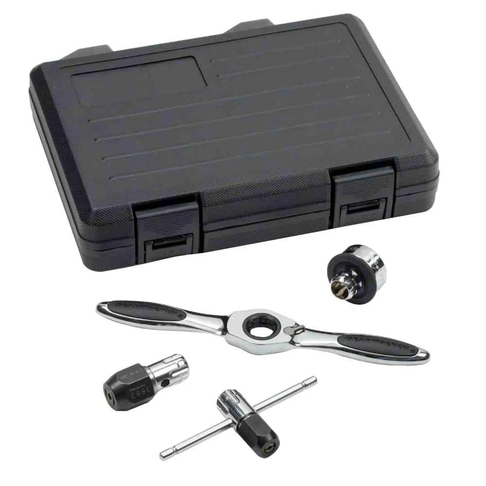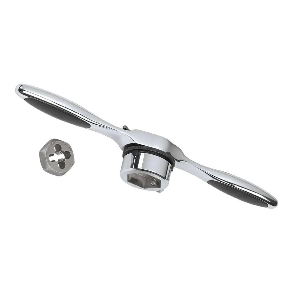 5° Ratcheting arc with reversible lever eliminates hand over hand turning. Patented Twist Lock Guide System reduces back walk of die guard. Auto locking feature allows for safe removal of tap adapter. Spring-loaded cap allows for quick-release of large tap adapter. Extension adapters provide access in tight confined areas. Extend the length of tap and die system by combining adapters and any standard 3/8 drive extension. Die adapter works with Pass-Thru Ratchet and Socket System as well as Vortex socket accessories. Works on round and hex shaped dies.